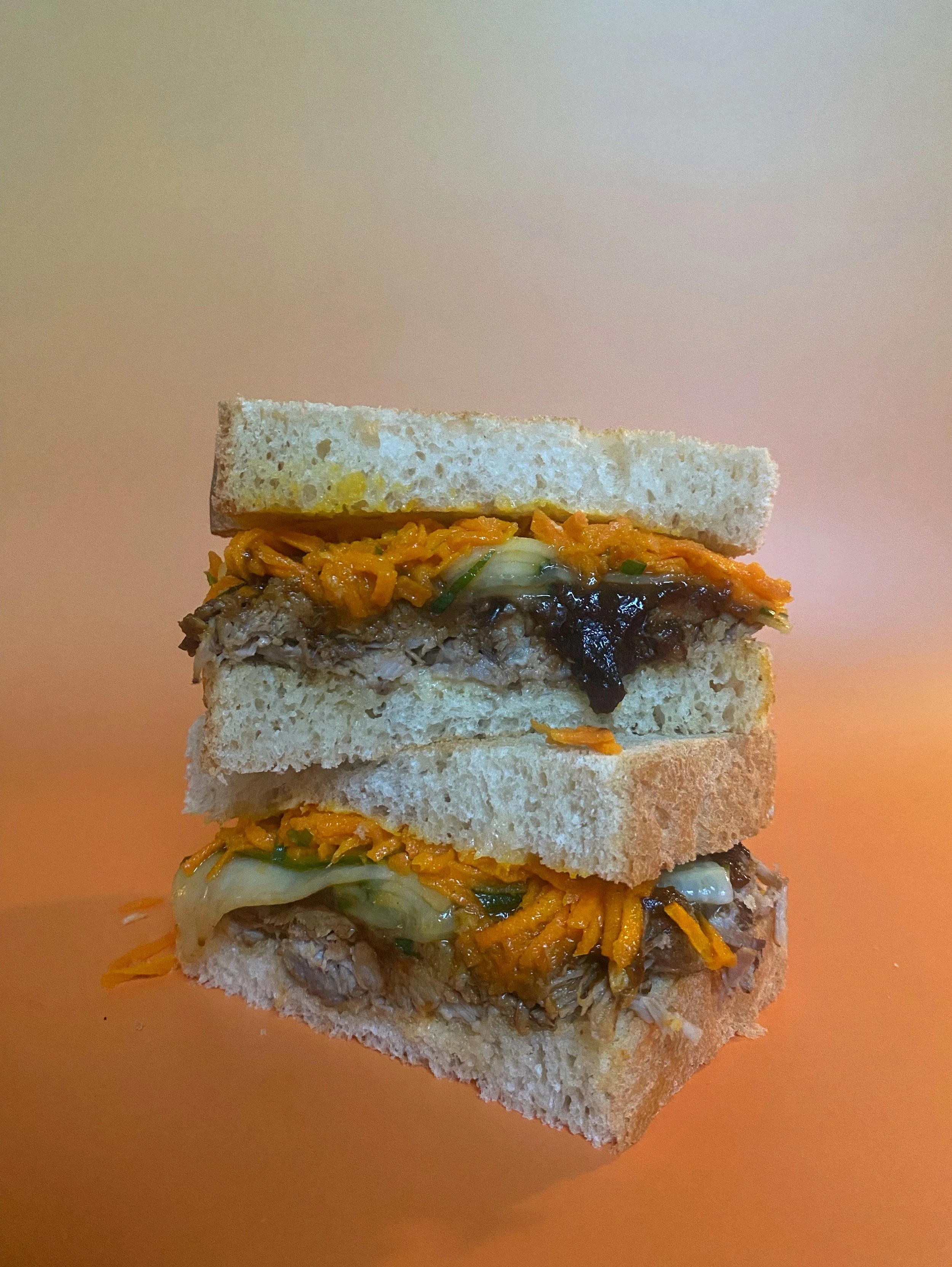 Beer braised pulled pork, dill pickled cucumber, black treacle bbq sauce, and carrot slaw.